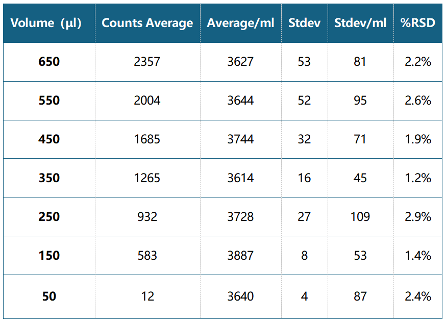 为了满足药典200μL 的测试需求,验证仪器微量的精确度,下表采用 USP Particle Count RS的标准粒子,分别取不同体积的样品,最小取样量到50μL,其RSD值仍维持在2.4%,可见其在小容量取样体积上的高精度和高准确性。