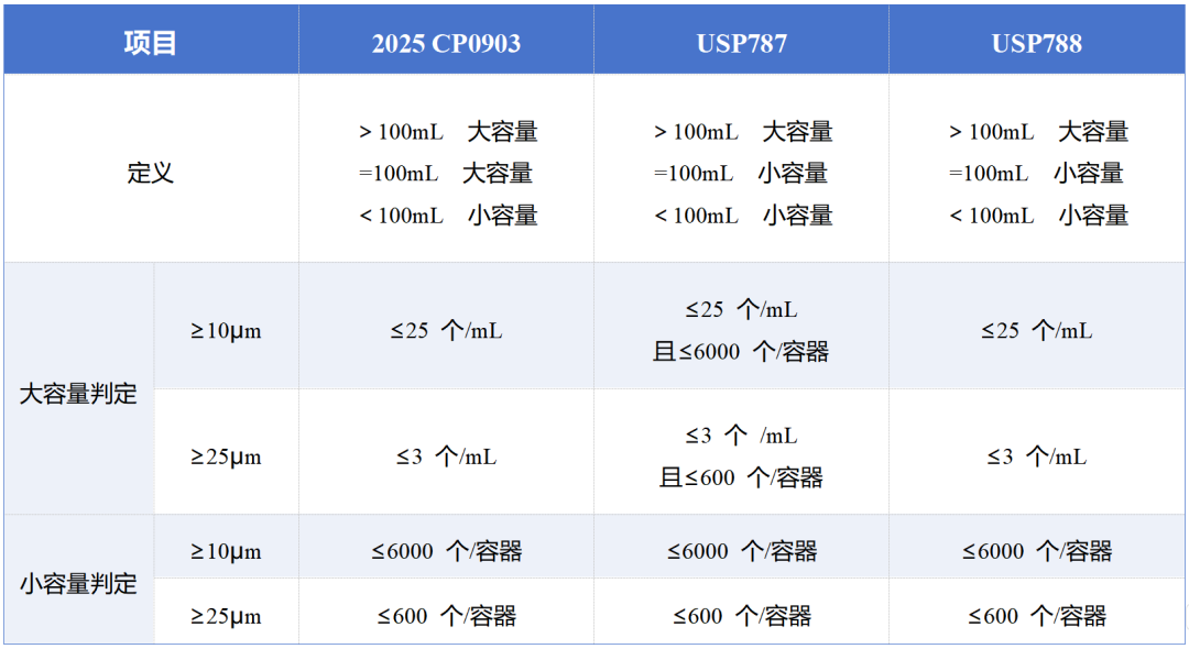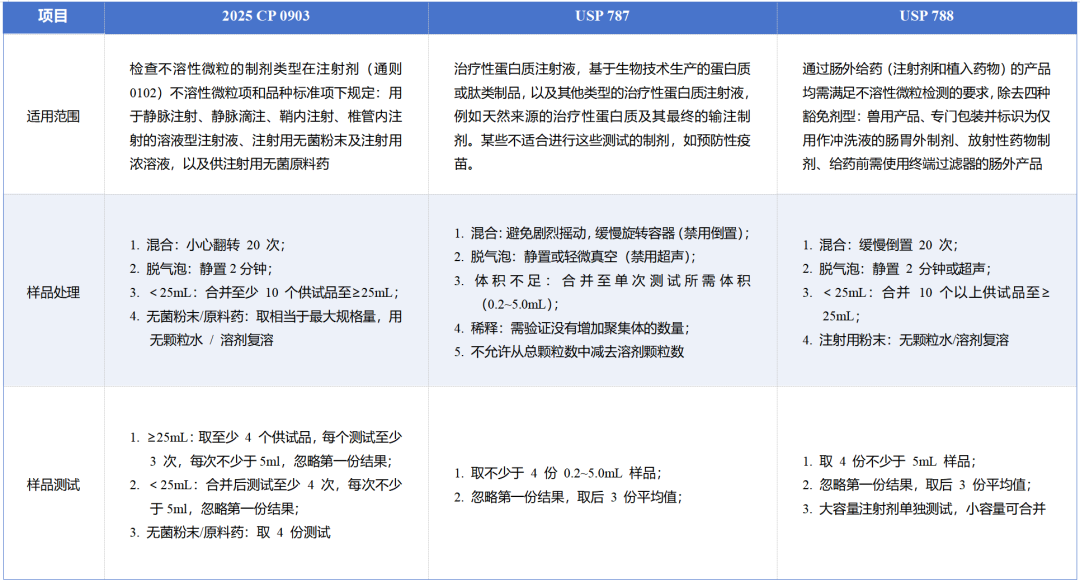 上表对比了中美药典在不溶性微粒检测法,中美药典在使用范围、样品细节处理和样品测试上有所差异,相比2025 CP0903和USP788的普通注射液,USP787针对的是蛋白注射液,需要兼顾蛋白注射液的特殊理化性质:如混合时不能剧烈摇动、不允许超声脱气泡、稀释需要验证有无聚集体产生,并规定了取样体积0.2~5.0mL,减少样品浪费和蛋白吸附。2025 CP0903 则提供了更多检测的选择,规定了小容量可以通过单支或者混合的方式进行检测。另外2026版本的USP788即将更新关于小容量的新方法。